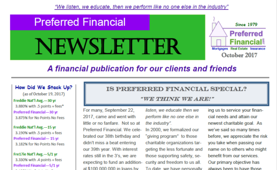 Preferred Financial Newsletter Oct. 2017 Preferred Finacial’s October 2017 Newsletter covers an array of Mortgage, Real Estate, and Insurance information. This newsletters covers topics such as the Federal Reserve, Refinance Analysis, Reverse Mortgages, VA Loans and more. Click the link above to view our Newsletter. Enjoy!