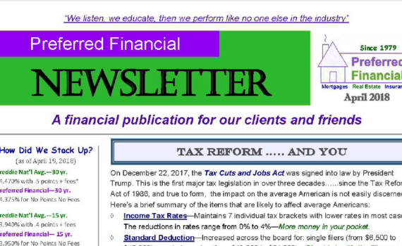 Preferred Financial Newsletter: April 2018 Preferred Financial’s April 2018 Newsletter covers an array of Mortgage, Real Estate, and Insurance information. This newsletters covers topics such as Tax Reform and You, Mortgage Rates, Higher Loan Limits, Blended Interest Rates and Income Tax Rates. Click the link above to view our […]
